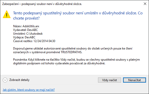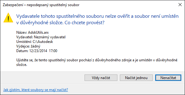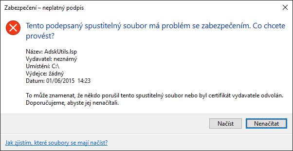 Při načítání vlastního souboru programu, který byl digitálně podepsán, ověří program založený na aplikaci AutoCAD nebo aplikace AutoCAD LT digitální podpis připojený k souboru. Zobrazí se hlášení, zda bylo možné ověřit digitální podpis, aby se mohl uživatel rozhodnout, zda soubor programu do prostředí výkresu načte nebo ne.