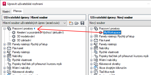 V podokně Uživatelské úpravy <název souboru> (vpravo) přetáhněte pracovní prostor ze souboru CUIx do uzlu Pracovní prostor hlavního souboru CUIx v podokně Uživatelské úpravy <název souboru> (vlevo).