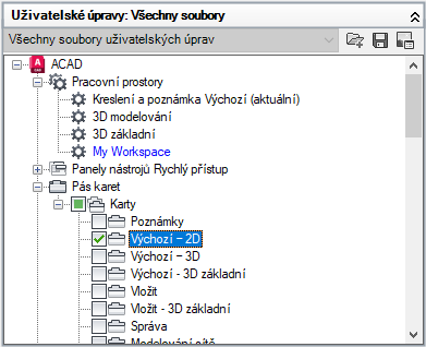 Nastavení aktuálního pracovního prostoru v editoru Upravit uživatelské rozhraní (CUI):