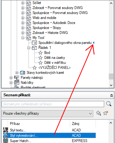 Přiřazení příkazu ke spuštění dialogu panelu