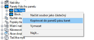 Kopírovaný panel nástrojů bude umístěn pod uzel Pás karet