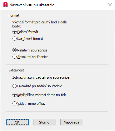 Nastavení pod položkou Zadání ukazatele ovlivní způsob, kterým zadáváte hodnoty souřadnic, když je dynamické zadání aktivní. Kliknutím na tlačítko Nastavení zobrazíte dialog Nastavení zadání ukazatele.
