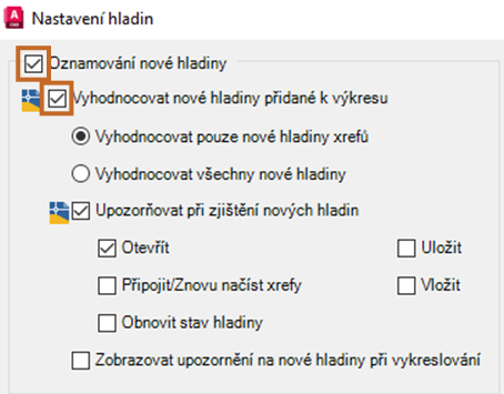 Každá možnost označuje, kdy se oznámení zobrazí. Pokud je tedy vybrána možnost Otevřít a je k dispozici nová hladina, zobrazí se při otevření výkresu upozornění. Pokud je vybrána možnost Uložit a existuje nová hladina, zobrazí se při každém uložení upozornění.