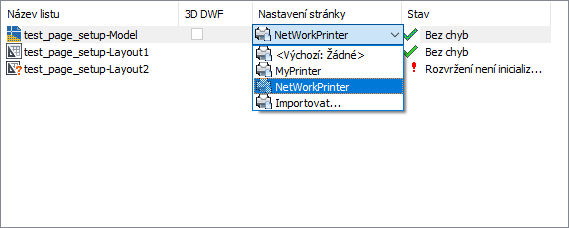 Poznámka: Počet importovaných nastavení stránek můžete snížit přidáním pojmenovaných nastavení stránek do souborů šablon výkresů. Poté je budou mít všechny nové výkresy založené na těchto šablonách automaticky k dispozici.