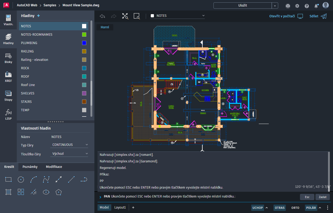 S webovou aplikací AutoCAD již nejste vázáni na konkrétní počítač. Není vyžadována žádná instalace softwaru, protože aplikace běží online ve webovém prohlížeči, například Chrome nebo Firefox. Její uživatelské rozhraní vypadá podobně jako rozhraní aplikace AutoCAD pro stolní počítače s panely vlastností, pásem karet a příkazovým řádkem.