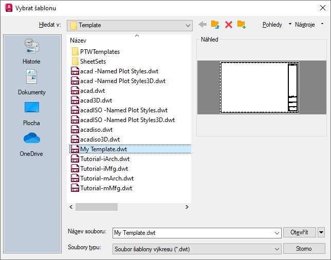 Při vytvoření nového výkresu použije nyní aplikace AutoCAD šablonu MyTemplate.