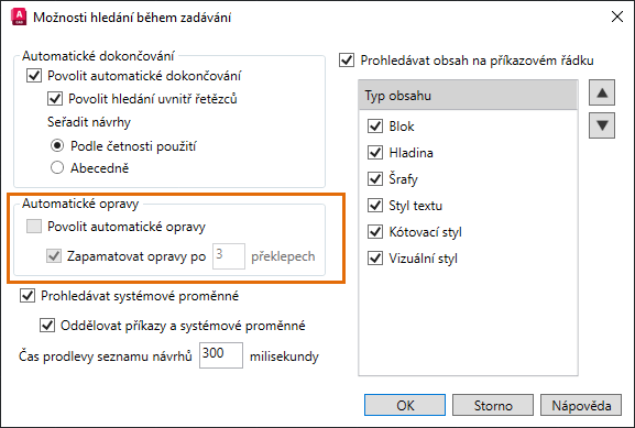 Pokud často chybně zadáte některé příkazy, můžete zkusit automatické opravy. Pokud je funkce automatických oprav povolena, seznam návrhů příkazového řádku nabízí návrhy založené na překlepů, které jste provedli v minulosti. Do seznamu automatických oprav můžete také ručně přidat příkazy a systémové proměnné, které obvykle píšete nesprávně.