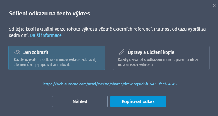 Sdílením odkazu na kopii aktuálního výkresu umožníte jeho zobrazení nebo úpravy ve webové aplikaci AutoCAD. Jsou zahrnuty všechny související externí reference a obrázky DWG.