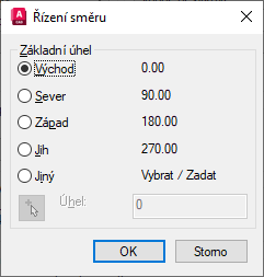 Nastavuje orientaci nulového úhlu. Následující volby ovlivňují zadávání úhlů, formát zobrazení a zadávání v polárních, válcových a sférických souřadnicích.