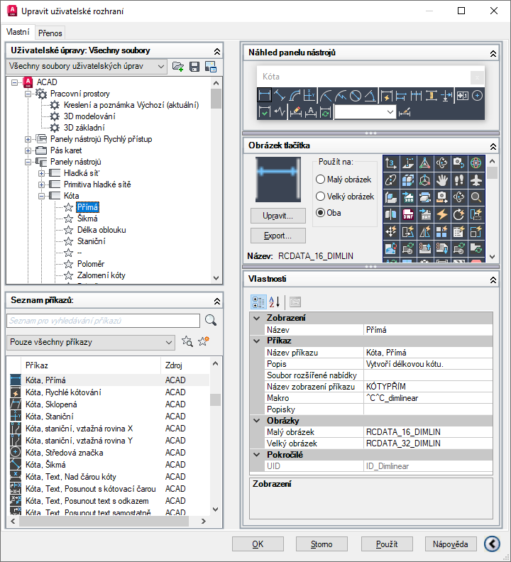 Malý obrázek –·Určuje, že při přidání příkazu do panelu nástrojů, nabídky nebo panelu pásu karet bude použit malý obrázek.