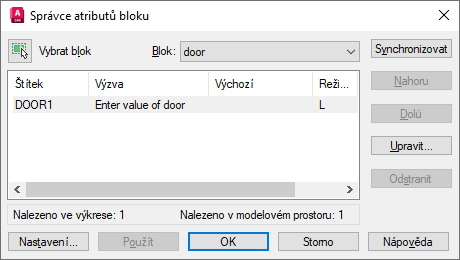 V seznamu atributů se zobrazí atributy vybraného bloku. Implicitně se v seznamu atributů zobrazují vlastnosti atributů: Štítek, Výzva, Výchozí, Režim a Popisný. Popis pod seznamem atributů zobrazuje počet instancí v aktuálním výkresu a v aktuálním rozvržení každého vybraného bloku.