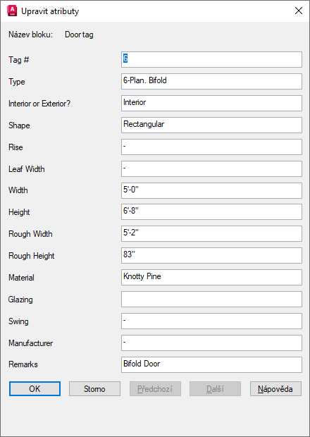 Tento dialog slouží ke změnám hodnot určitých atributů bloku. Chcete-li změnit vlastnosti atributu, jako je poloha, výška a styl, použijte příkaz -ATREDIT.