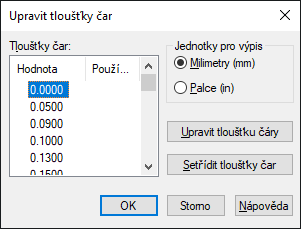 Definuje jednotky, ve kterých se zobrazí seznam tlouštěk čar.