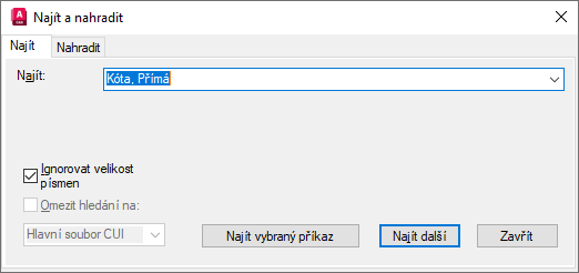 Vyhledává a nahrazuje příkazy nebo vlastnosti příkazů (názvy příkazů, popisy nebo makra). Pomocí karty Najít lze vyhledat zadaný textový řetězec a pomocí karty Nahradit lze zadaný textový řetězec vyhledat a nahradit.