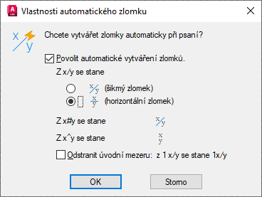 MTEXT (příkaz) Hledat: Vyberte složený zlomek v textovém editoru na místě > > Vlastnosti zlomku > Automatický zlomek