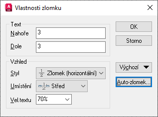 Zobrazí dialog Vlastnosti automatického zlomku. Automatický zlomek zalomí pouze numerické znaky těsně před nebo za znaky stříška, lomítko a křížek.