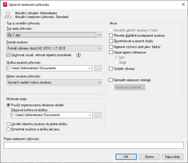 Pokud je tato volba aktivní, kontroluje výkresy na přítomnost chyby. Pokud jsou zjištěny chyby, budou výkresy automaticky obnoveny. Možnost Nastavit výchozí plotr jako „žádný“ změní nastavení tiskárny nebo plotru v sadě převodu na hodnotu Žádný. Nastavení lokální tiskárny/plotru není obvykle pro příjemce důležité.