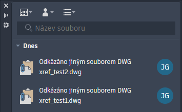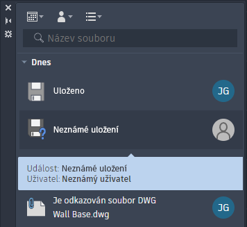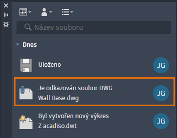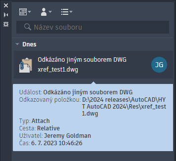 Přesunutím kurzoru nad událost Odkázáno jiným souborem DWG zobrazíte její podrobnosti.