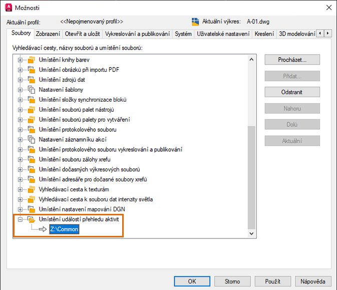 Nejprve je třeba definovat společné umístění pro události výkresu. To by mělo být umístění v rámci interní podnikové sítě nebo v cloudovém úložišti.