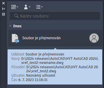 V této části přejmenujeme soubor xref_test2.dwg pomocí Průzkumníku souborů a uvidíme, jaký typ události se zobrazí na paletě Přehled aktivit.