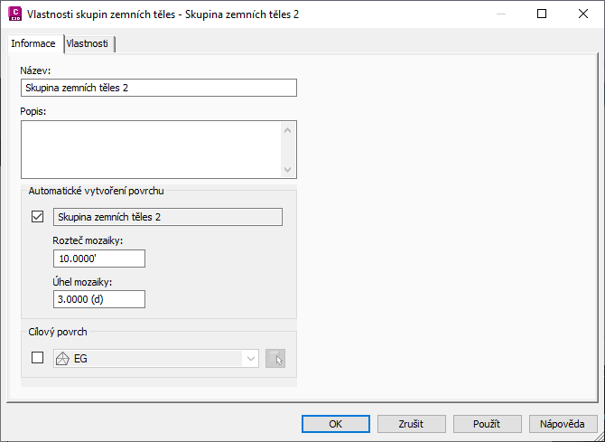 Při opravě triangulace bude potřeba nastavit nižší hodnotu rozteče mozaiky ve skupině zemních těles. Jak je vidět na obrázku 26, ne vždy je možné tuto hodnotu v dialogu Vlastnosti skupiny zemních těles, protože ji lze nastavit jen tehdy, je-li zapnuta možnost Automatické vytvoření povrchu. Toto nastavení se ale využívá i u příkazu Vytvořit odpojený povrch a při triangulaci násypu zemního tělesa. V této situaci je nejlepším řešením zapnout možnost Automatické vytvoření povrchu, změnit rozteč mozaiky z výchozí hodnoty 10 stop na 1 stopu a poté možnost Automatické vytvoření povrchu opět vypnout. Po zapnutí možnosti Automatické vytvoření povrchu je potřeba kliknout na tlačítko Použít, aby se projevily provedené změny nastavení.