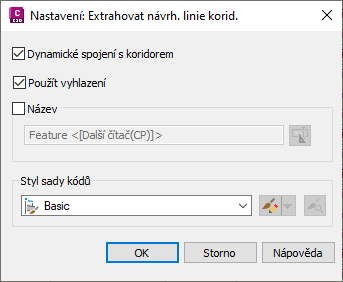 Osvědčenou metodou je vybrat v dialogu Nastavení nástroje Extrahovat návrhové linie koridorů možnost Dynamické spojení, jak je znázorněno na obrázku 35, takže v tomto případě se všechny změny koridoru odrazí také na zemním tělese na této ploše. Dále existují nastavení pro vyhlazení, která umožňují řídit tvar návrhové linie po celé délce okolo zakřivené oblasti. Další informace naleznete v části Vyhlazení návrhové linie.