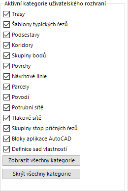 Při provádění určitých úloh v okně Project Explorer je v něm někdy vhodné zakázat nebo skrýt všechny kategorie objektů aplikace Civil 3D, které se nepoužívají.Project Explorer