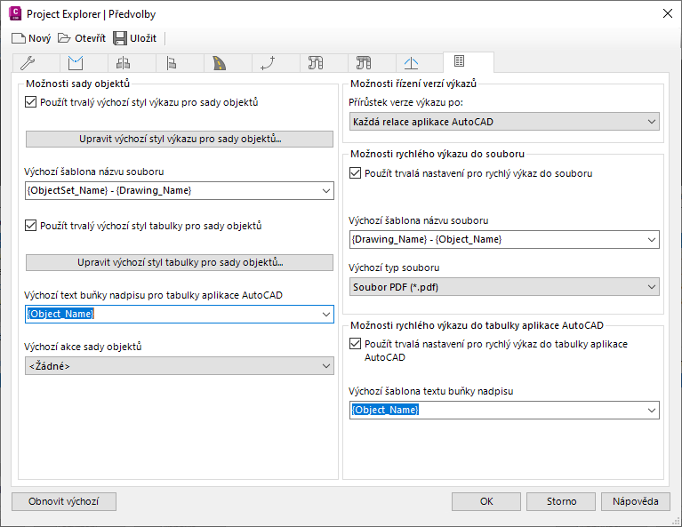 Karta Předvolby výkazů a tabulek