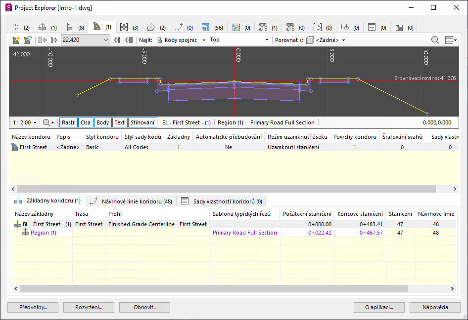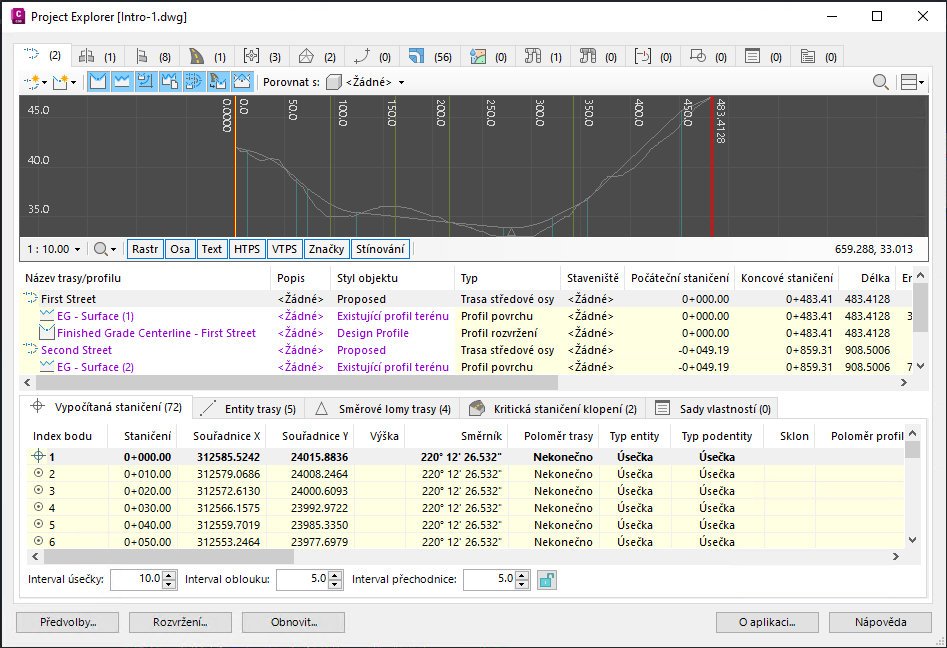 Máte možnost upravit interval staničení (řetězení) trasy/profilu pro entity úseček, oblouků a přechodnic.