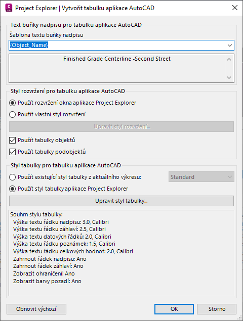 Nastavení v okně Vytvořit tabulku aplikace AutoCAD lze kdykoli obnovit na výchozí hodnoty. Slouží k tomu tlačítko Obnovit výchozí v levém dolním rohu okna.