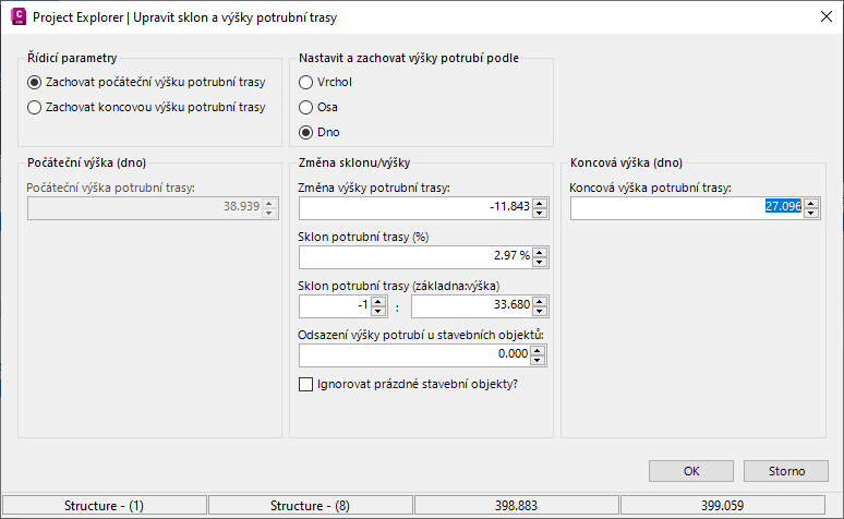 Můžete použít novou hodnotu sklonu potrubí při zachování výšky začátku nebo konce vybrané potrubní trasy. Pokud v aktuální trase dojde k nějakým změnám průměru potrubí, můžete nastavit, zda se mají při křížení jednotlivých stavebních objektů zachovat zachovány výšky dna potrubí, vrcholu potrubí nebo osy potrubí. Sklon potrubí lze vyjádřit v procentech nebo hodnotou základna:výška. V případě potřeby lze při křížení jednotlivých stavebních objektů v potrubní trase použít odsazení výšky.
