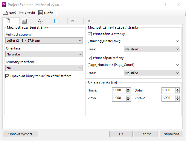 Možnosti výkazu určují velikost stránky, orientaci stránky, okraje stránky, záhlaví výkazu, záhlaví stránky a zápatí stránky pro všechny výkazy a tabulky vygenerované pomocí okna Project Explorer.