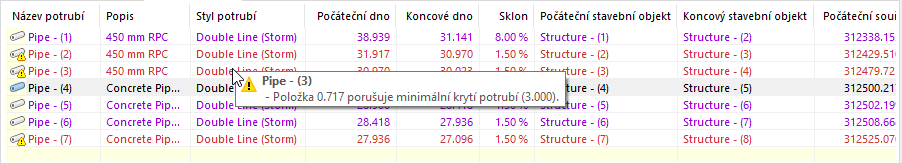 - Potrubí: Položka {x} porušuje minimální krytí potrubí ({y}).