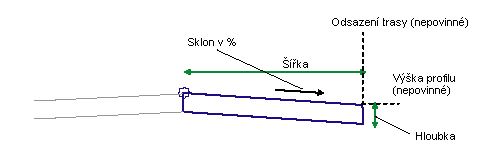 Výška hrany vozovky se vypočte podle hodnot vstupních parametrů Šířka a Sklon v %. Šířka se potom naváže na trasu odsazení. |