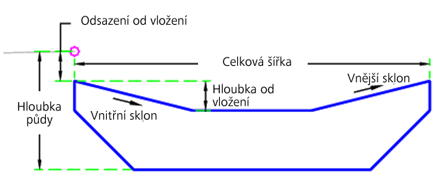 Počáteční bod se nastaví v bodu připojení. Dešťová zahrada se pak upraví podle zadané vzdálenosti odsazení. Hloubka dešťové zahrady se nastaví na základě vstupních hodnot.