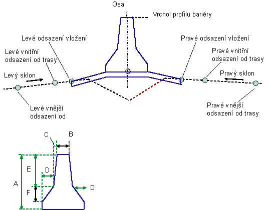 V režimu návrhu se nakreslí střední dělicí pás a bariéra s pevnými kótami tak, jak je uvedeno na následujícím diagramu. To je stejný obrázek, jaký je nakreslen v režimu návrhu pro podsestavu PřekrytíMediánuAsymetrické.