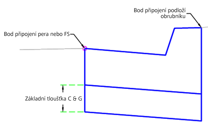 | Základní tloušťka C & G | Tloušťka základny pod obrubníkem a rigolem | Numerický, kladný |