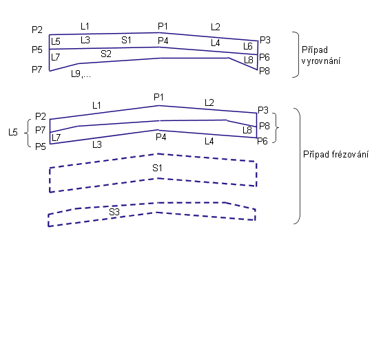 Spojnice překrytí. Všimněte si, že L5, L6 jsou od spodní části překrytí do horní části překrytí jak v případě vyrovnání, tak frézování. |