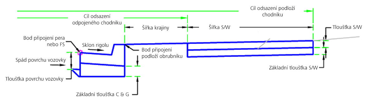 | Odsazení zadní části chodníku | Může se použít k přepsání pevné šířky chodníku a k navázání vnější hrany chodníku na trasu odsazení. Jako cíle pro určení šířky lze použít následující typy objektů: trasy, křivky, návrhové linie nebo polygony zaměření. | Volitelný |