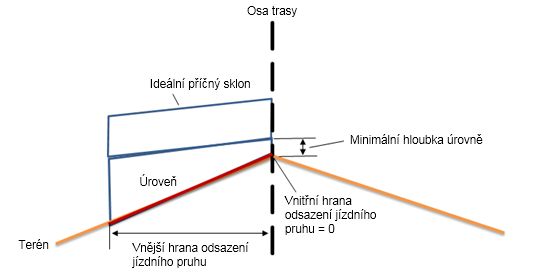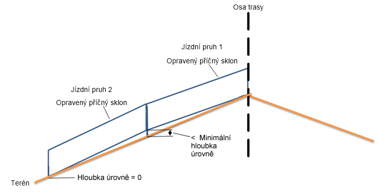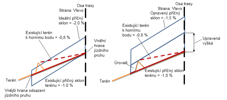 | Tolerance sklonu | Sklon existujícího terénu mínus ideální příčný sklon se rovná -1 %, což je hodnota větší než tolerance sklonu (0.5 %). |