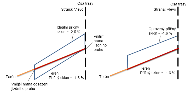 | Opravený příčný sklon | Opravený příčný sklon bude mít hodnotu -1.6 %. |