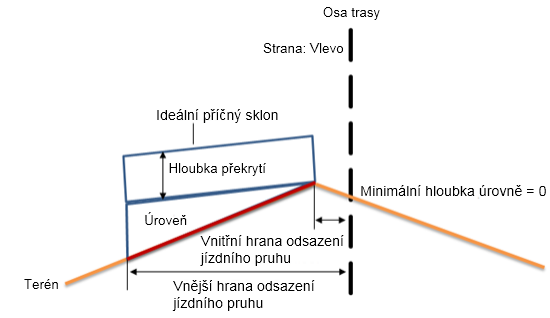 | Tolerance sklonu | Sklon existujícího terénu mínus ideální příčný sklon se rovná -1 %, což je hodnota větší než tolerance sklonu 0.5 %. |