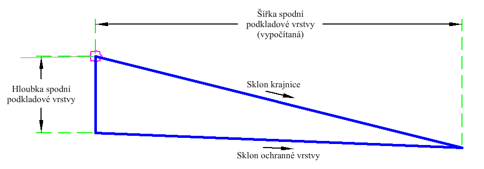 Je vložena krajnice pro danou hloubku krajnice, sklon krajnice a ochrannou vrstvu krajnice. V místě, kde se protíná sklon krajnice a ochranná vrstva krajnice, se vypočítá šířka. Pak se vypočítají body, spojnice a tvary.