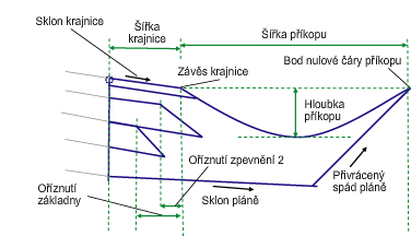| Přivrácený spád pláně | Hodnota přivráceného spádu spodní vrstvy podkladu pro navázání na vrchol příkopu. | Numerický, kladný | 2 ( : 1) |