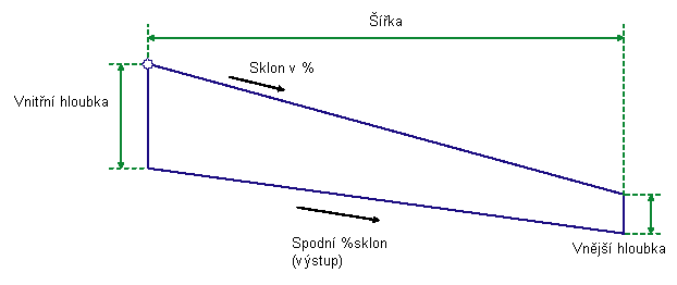 Upravený terén tvaru se vkládá pro dané hodnoty položek Šířka a Sklon v % směrem ven od bodu připojení. Sklon spodní spojnice se vypočte na základě vnitřní a vnější hloubky tvaru. Kódy bodů, spojnic a tvarů se nastavují jako vstupní parametry pomocí uživatelem definovaných řetězců.