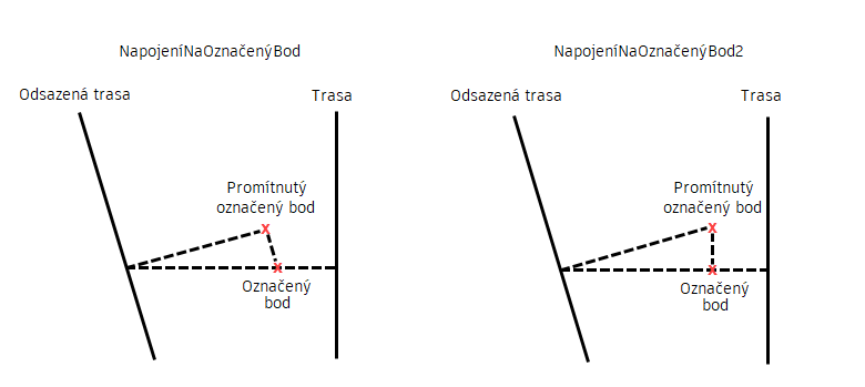 Základní rozdíl mezi podsestavou NapojeníNaOznačenýBod2 a podsestavou NapojeníNaOznačenýBod je ve způsobu použití, kdy označený bod je na odsazené základně šablony typických řezů v porovnání ke spojnici. Následující obrázek znázorňuje rozdíl mezi dvěma podsestavami.