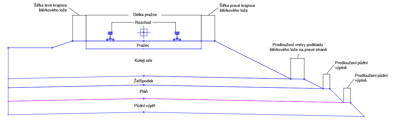 | Prodloužení spodní vrstvy podkladu | Vzdálenost od paty materiálu podkladu štěrkového lože k začátku sklonu boční strany materiálu spodní vrstvy podkladu | Numerická, nezáporná |