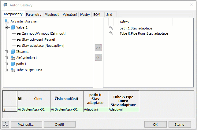 - Po vyplnění všech dalších vlastností iSestavy aplikace Inventor klikněte na tlačítko Ověřit k potvrzení konfigurace této sestavy. Člen sestavy primárních vedení může být například v rodině iSestav adaptivní pouze jednou a sloupec KS rozpisky může obsahovat pouze číslo nebo řetězec Výchozí.