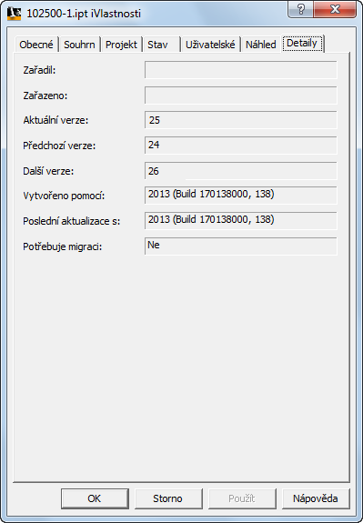 V aplikaci Inventor lze zkontrolovat stav migrace souboru prostřednictvím iVlastností.