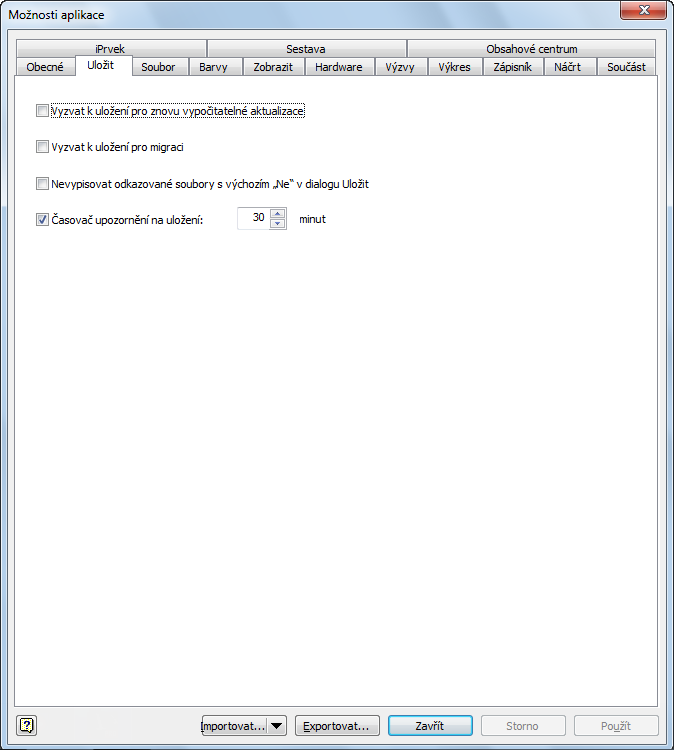 V dialogu Možnosti aplikace můžete na kartě Uložit nastavit, aby se při otevření a zavření souborů ze starší verze aplikace Inventor zobrazila výzva k jejich uložení a migraci.